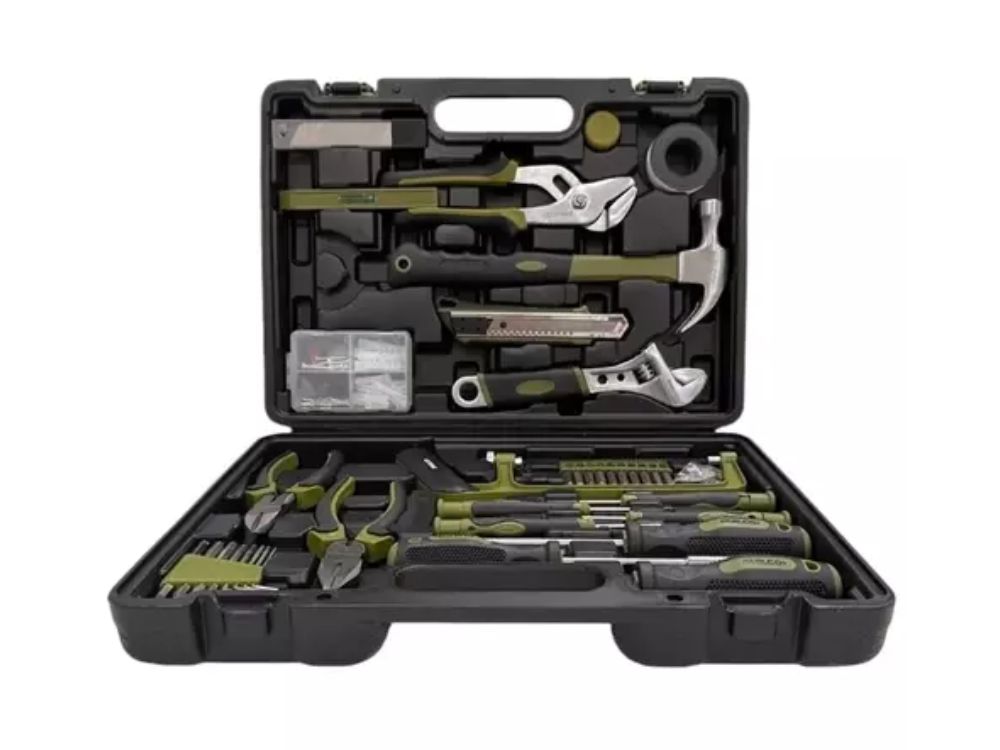 EL KIT INCLUYE : DESTORNILLADORES , SIERRA, PINZAS, LLAVE AJUSTABLE, MARTILLO, MARTILLO